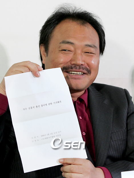가수 김흥국이 4일 서울 여의도 대한가수협회 사무실에서 제18대 국회의원 출마 입장 관련 기자회견을 가져 "국회의원에 출마 한번 해보면 어떻겠냐"는 지인들의 권유는 있었으나 "출마 할 계획 없고 가수(방송) 활동에만 전념하겠다"고 밝혔다. 김흥국이 미리 준비해온 기자회견 관련 문서를 기자들을 향해 들어보이고 있다. /황세준 기자 storkjoon@osen.co.kr