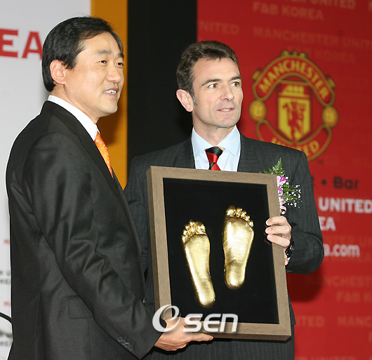 맨체스터 유나이티드 에프앤비 코리아(맨유 F&B 코리아)는 5일 임피리얼팰리스 호텔에서 맨유 마케팅 디렉터 롭 제임스, 맨유 F&B 코리아 김치곤대표가 참석한 가운데 한국내 맨유 '레스토랑 &바' '카페&바'에 대한 맨유 F&B 코리아의 독점사업 공식 조인식을 가졌다. 롭 제임스가 조인식 기념으로 박지성의 풋프린트를 김치곤 대표에게 전달하고 있다./손용호 기자spjj@osen.co.kr