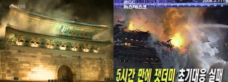 지상파 TV 3사가 국보 제 1호 숭례문(남대문)의 전소 사건 보도를 너무 소홀히 한 것 아니냐는 시청자 원성이 높아지고 있다. 숭례문은 지난 10일 오후 8시48분 검거된 피의자 채모씨(69)의 방화로 불타기 시작해 5시간 후 석조 부분을 제외한 누각 전체가 전소됐다. 대한민국을 상징하는 국가의 보물 1호가 불에 타 무너지는 모습을 보면서 국민들의 가슴도 시커멓게 타들어간 대재난이었다. 그럼에도 이날 화재 현장은 케이블 뉴스전문 채널 YTN이 생중계로 보도했을 뿐, 지상파 3사는 정규 방송을 계속하며 간간이 자막으로 속보를 전하는 데 그쳤다. 미국의 상징물인 자유의 여신상이 불타는 것이나 다름없는 국가의 재난 사건 현장을 국민에게 제대로 보여준 지상파 TV의 뉴스는 어디서도 찾을수 없었다. 특히 3사의 저녁 메인뉴스들은 당초 소방당국의 오판으로 화재가 조기 진화되는 것으로 알려지면서 상황을 일찍 종료하는 실수까지 저질렀다. 그러나 숭례문을 집어삼킨 화마는 발화 2시간여 후인 오후 10시 40분쯤 2층 현판 5m 안쪽 지점에서 다시 거세지면서 목조 문화재에 치명적인 손상을 안겼다. 전국민과 지역을 대상으로 한 지상파 TV는 각 채널별 전파의 점유 권리와 함께 의무도 갖고 있다. 국가적인 재난 시에 이를 빠르고 정확히 보도하는 것도 그 의무 가운데 하나다. 특히 공영방송인 KBS는 이를 책임질 의무가 다른 민영방송보다 더 강함에도 이번 숭례문 화재 보도에서 마찬가지로 뒷짐을 놓고 있었다는 지적이다. KBS 뉴스 등 지상파 3사의 보도 프로그램들은 뒤늦게 남대문 전소 과정을 심층 보도했다. '서울 한복판에 있서 믿기지 않는일이 벌어졌습니다. 국보 1호, 숭례문이 불에 타 무너졌습니다. 먼저, 발화에서 전소까지의 과정을 OOO 기자가 보도합니다.(중략) 결국 대한민국 국보 1호는 화재 발생 5시간 만인 1시 55분, 완전히 주저앉고 맙니다. 2시 5분, 불은 모두 꺼졌지만 서울에서 가장 오래된 목조 건물은 잿더미가 되고 난 뒤였습니다'.(KBS 뉴스) 소잃고 외양간 고치 듯 숭례문 화재의 보도 책임을 직무유기한 뒤에야 호들갑을 떨었던 셈이다. mcgwire@osen.co.kr KBS와 MBC 뉴스 홈페이지 자료 사진