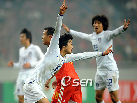 열광적인 치우미(球迷)의 응원이 부족했던 것일까. 허정무 감독이 이끄는 축구 국가대표팀이 17일 중국 충칭 올림픽스포츠센터에서 열린 동아시아선수권 대회 개막전 중국과 경기서 박주영의 2골과 곽태휘의 결승골에 힘입어 3-2 재역전승을 거두었다. 이로써 한국은 1978년 태국 방콕 아시안게임서 중국과 첫 대결, 승리를 거둔 후 이날까지 총 27번의 대결을 통해 16승 11무로 무패행진 기록을 이어갔다. 이날 모든 표가 매진됐다는 보도와는 달리 관중석은 빈 곳을 찾아보기 쉬웠다. 그러나 운동장을 찾은 치우미는 중국 대표팀에 열광적인 응원을 보냈다. 한국 응원단인 붉은악마도 약 50여 명이 경기장을 찾았지만 충돌은 일어나지 않았다. 이날 중국은 무기력한 전반을 끝내고 후반 2분과 16분에 연속골을 뽑아내며 '공한증'을 깰 수 있는 기회를 맞았다. '꿈은 이루어진다'와 같은 표어인 '위안멍(圓夢, 꿈을 이룬다)'과 함께 '짜요(加油)'를 외치던 그들의 꿈은 후반 19분 터진 박주영의 동점골로 일장춘몽처럼 사라지고 말았다. 한국은 이날 승리로 중국에 여전히 절대적인 우위를 점하게 됐고 이번 대회에 나온 양 국 대표팀에는 오는 8월 베이징 올림픽에 출전할 선수들이 대거 포함되어 있어 본선서 만날지도 모를 중국전에 대비한 경험을 쌓는 기회가 됐다. 10bird@osen.co.kr 후반 역전골을 넣은 곽태휘가 환호하고 있다./ 충칭=손용호 기자spjj@osen.co.kr