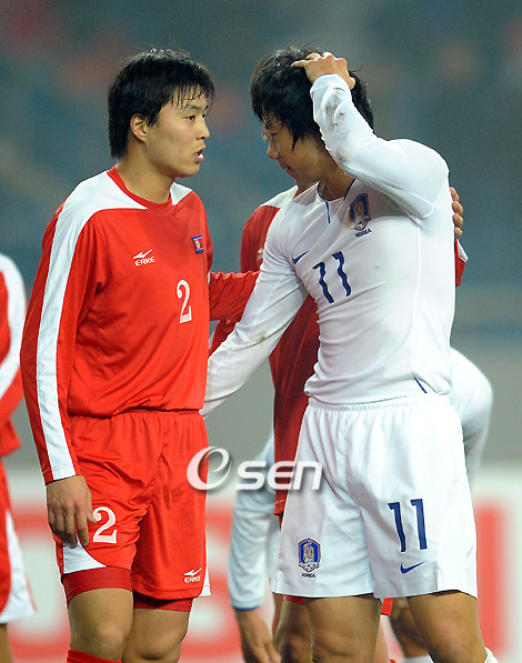 한국 북한 일본 중국이 패권을 다투는 '동아시아축구선수권대회' 한국-북한의 경기가 20일 중국 충칭 올림픽스포츠센터에서 벌어져 전반 염기훈의 골로 앞서 나가던 한국이 후반 북한의 정대세에게 동점골을 내줘 1-1 승부를 가리지 못했다. 후반 북한 문전에서 골키퍼와 충돌해 머리를 아파하는 염기훈에게 북한 차정혁이 '괜찮냐'며 어깨를 두드려 주고 있다./ 충칭=손용호 기자spjj@osen.co.kr