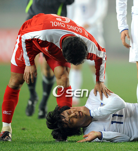 한국 북한 일본 중국이 패권을 다투는 '동아시아축구선수권대회' 한국-북한의 경기가 20일 중국 충칭 올림픽스포츠센터에서 벌어져 전반 염기훈의 골로 앞서 나가던 한국이 후반 북한의 정대세에게 동점골을 내줘 1-1 승부를 가리지 못했다. 전반 공중볼을 다투다 넘어진 염기훈에게 북한 남성철이 '괜찮냐'며 위로하고 있다./ 충칭=손용호 기자spjj@osen.co.kr