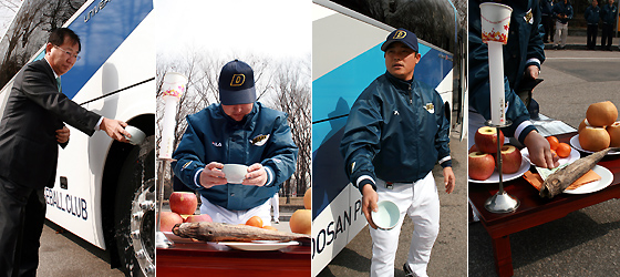 두산 베어스는 21일 낮 12시 30분 잠실구장 서문 출입구 앞에서 올 시즌 버스 운행시 무사고를 기원하는 고사를 지냈다. 이날 고사는 김진 사장을 비롯, 김경문 감독과 김광수 수석코치, 선수단을 대표한 주장 김동주 및 임직원이 참석해 2008시즌 버스 운행 무사고를 기원했다. 이번 신규 구입한 버스 2대는 1군의 원정경기시 사용되며, 구입 총액 3억 2000만 원에 이르는 최신형 리무진 버스로 안전장치와 편의시설을 고루 갖추고 있다. heman81@osen.co.kr