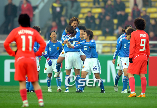 한국 여자축구의 동아시아선수권 2연패 꿈이 무산됐다. 안익수 감독이 이끄는 한국 여자 대표팀이 21일 중국 융촨 올림픽센터에서 열린 2008 동아시아선수권 대회 일본과 경기서 2-0으로 완패했다. 지난 18일 중국과 경기서 아쉬운 2-3 재역전패를 당해 반드시 이겨야 했던 한국은 일본의 기술에 밀려 제대로 경기를 풀어가지 못했다. 주전 선수들의 부상으로 대표팀 구성에 어려움을 겪은 한국은 젊은 선수들로 팀을 꾸렸지만 실력차는 대단했다. 한국은 전반 16분 선제골을 내주었다. 일본은 긴가 유카리가 우리 진영 오른쪽에서 문전으로 올린 크로스를 대기하고 있던 아라카와 에리코가 머리로 받아 넣어 득점으로 연결했다. 첫 실점 후 한국은 빠른 패스 연결로 동점골을 만들기 위해 노력했다. 그러나 번번이 일본의 기술에 밀려 볼 키핑도 제대로 하지 못하는 등 어려움을 겪고 슈팅 기회조차 만들기 어려웠다. 후반서도 일본의 공세는 이어졌다. 허둥대는 한국에 비해 안정적인 경기 운영을 보인 일본은 후반 11분 추가골을 터트렸다. 공격수 오노 시노부가 페널티박스 오른쪽에서 롱 패스를 이어받아 그대로 오른발 슈팅을 날린 것이 한국 골문을 흔들었다. 한국은 후반 34분과 38분 측면 돌파를 통해 일본의 골문을 열기 위해 노력했지만 일본의 수비에 막혀 슈팅 기회를 만들어 내지 못했다. 이날 한국은 기술과 체력 모두 일본에 한 수 아래의 열세를 보이며 완패했다. 10bird@osen.co.kr 후반 일본에 두 번째 골을 허용한 한국의 박희영과 한송이가 망연자실한 자세로 일본 선수들이 환호하는 모습을 바라보고 있다./융촨=손용호 기자spjj@osen.co.kr