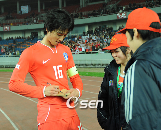 한국 북한 일본 중국이 패권을 다투는 '동아시아축구선수권대회'서 한국-일본이 23일 중국 충칭 올림픽스포츠센터에서 대회 우승을 놓고 일전을 벌여 1-1 무승부를 기록했다. 한국은 우승을 위해 북한과 중국의 경기 결과를 기다려야 한다. 북한이 중국에 2골차 이상 승리를 거두면 북한이 우승한다. 곽태휘가 경기 진행자들에게 사인해 주고 있다./ 충칭=손용호 기자spjj@osen.co.kr