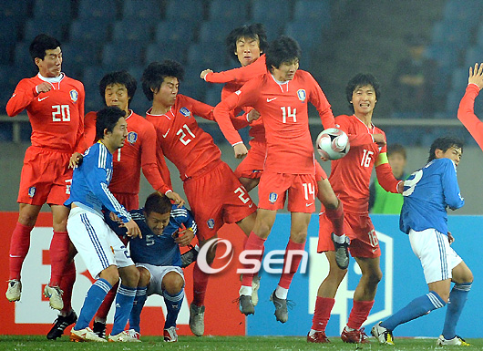 한국 북한 일본 중국이 패권을 다투는 '동아시아축구선수권대회'서 한국-일본이 23일 중국 충칭 올림픽스포츠센터에서 대회 우승을 놓고 일전을 벌여 1-1 무승부를 기록했다. 한국은 우승을 위해 북한과 중국의 경기결과를 기다려야 한다. 북한이 중국에 2골차 이상의 승리를 거두면 북한이 우승한다. 후반 일본의 프리킥을 한국 선수들이 몸으로 막고 있다./ 충칭=손용호 기자spjj@osen.co.kr