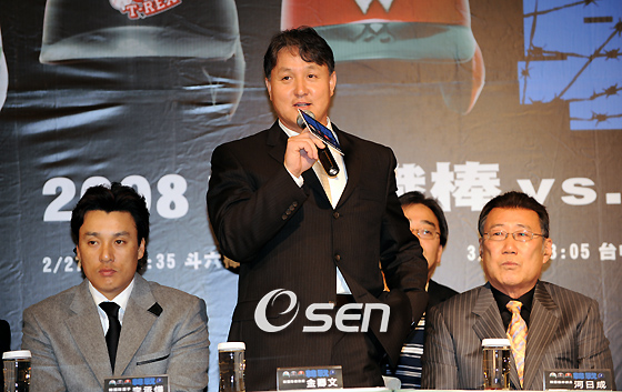 한국야구위원회(KBO)는 26일 오후 대만 타이중 스플렌더호텔에서 중화직업봉구대연맹(CPBL)과 친선경기 조인식을 가졌다. KBO 하일성 사무총장을 비롯해 김경문 대표팀 감독과 이승엽, 대만에서는 쑤지아치 타이중시 부시장, 자오쇼우보 CPBL 회장, 시에창훙 중신 웨일스 감독, 후창하오 싱농 불스 감독과 선수로 황충이(싱농 불스)와 왕촨지아(디미디어 티렉스) 등이 참석했다. 김경문 감독이 양국간에 활발한 야구 교류가 없어서 아쉬웠지만 이번 기회를 통해 활성화되기를 바란다고 인사말을 하고 있다./타이중=김영민 기자ajyoung@osen.co.kr