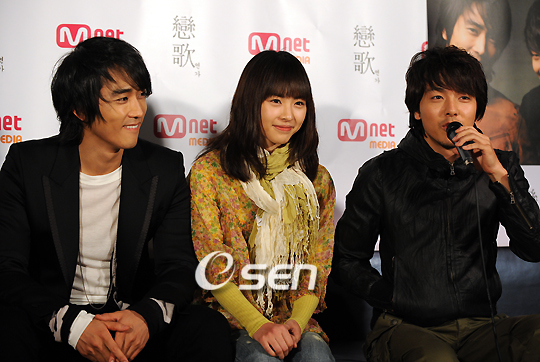 2001년 이미연의 '연가'에 이어 한류스타 송승헌과 박용하가 2008년판 컴필레이션 앨범 '연가'를 낸다. 이 작업의 일환으로 송승헌과 박용하가 '연가' 뮤직비디오 촬영현장 공개 행사 및 기자 간담회를 28일 저녁 서울 압구정동의 한 클럽에서 열었다. 송승헌 이연희 박용하가 기자회견을 갖고 있다. /황세준 기자 storkjoon@osen.co.kr