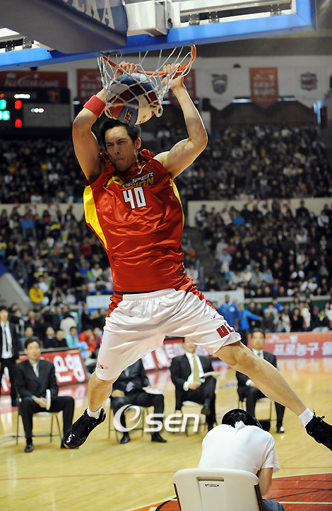 '우리가 덩크왕'. 1일 서울 잠실학생체육관에서 열린 2007~2008 SK 텔레콤 T 프로농구 올스타전 하프타임에 벌어진 덩크 컨테스트 결승서 이동준(대구 오리온스)과 테런스 섀넌(인천 전자랜드)이 각각 국내 선수 부문과 외국인 선수 부문서 1위에 올랐다. 국내 선수 예선부터 시작된 결승서 김효범이 첫 번째 주자로 나섰다. 교포 출신으로 운동 능력이 대단하다는 평가를 받은 김효범은 첫 번째 기회서 덩크를 성공하지 못해 낮은 점수를 받았다. 두 번째 시도서는 볼을 코트에 튀긴 후 그대로 투핸드 덩크를 시도했지만 볼은 림을 통과하지 못했다. 이동준은 첫 번째 시도서 안정적인 리버스 덩크로 심판 전원일치로 만점을 받았다. 두 번째 시도서는 관중을 골대 밑의 의자에 앉혀놓고 뛰어넘는 덩크를 성공해 다시 만점을 기록, 남자부 우승을 차지했다. 이동준은 화려한 두 개의 덩크를 성공시킨 후 반대편의 관중석에 있던 자신의 형 에릭 산드린(울산 모비스)와 함께 기쁨을 나누었다. 외국인 선수 중 첫 번째 주자로 나선 브랜든 로빈슨(서울 SK)은 두 번의 기회서 난이도 높은 덩크를 구사했지만 모두 실패해 팬들의 아쉬움을 샀다. 우승이 유력했던 테런스 섀넌은 첫 번째 시도서 팔꿈치를 접은 후 덩크를 시도했지만 아깝게 성공하지 못했다. 이어 섀넌은 팔꿈치까지 림 안에 집어 넣는 '팔꿈치 덩크'를 작렬했다. 두 선수가 동점을 기록한 가운데 한 차례씩 기회를 더 가진 선수들은 다양한 시도를 했다. 로빈슨은 코트 반대편서 빠른 걸음으로 달려와 자유투 라인 덩크를 시도했지만 성공하지 못했다. 그러나 섀넌은 360도 회전 덩크로 심사위원의 마음을 사로잡아 결국 우승을 차지했다. 10bird@osen.co.kr 이동준.
