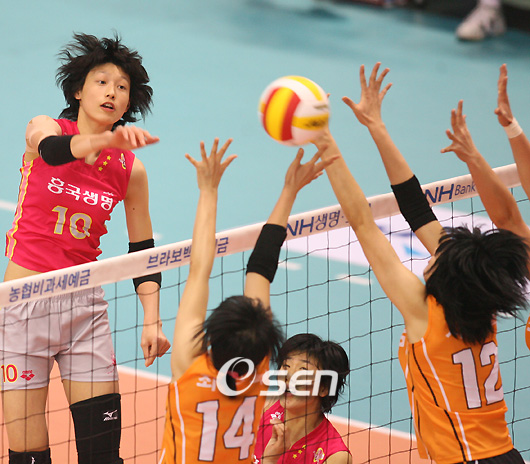 김연경이 활약한 흥국생명이 KT&G를 꺾고 5연승을 달렸다. 정규리그 우승을 확정지은 흥국생명이 1일 대전 충무체육관에서 펼쳐진 NH농협 2007-2008 V리그 여자부 KT&G와의 경기에서 세트스코어 3-1(26-24 25-23 19-25 25-21)로 승리를 거뒀다. 2위 KT&G는 4연패에 빠졌다. 25득점을 올린 김연경은 득점 부문에서 한송이를 제치고 1위에 다시 올라서며 개인타이틀 경쟁에 불을 붙였다. 황연주와 마리도 각각 14득점과 13득점씩 올렸다. 매 세트 접전을 펼쳤던 두 팀은 첫 세트부터 불꽃이 튀었다. 첫 세트 김연경과 황연수를 앞세운 흥국생명에 맞서 KT&G는 페르난다와 김세영이 활약했다. 결국 24-24 듀스까지 간 상황. 범실이 적기로 정평이 있는 KT&G가 먼저 범실로 한 점을 내줬다. 이후 랠리 끝에 김연경이 백어택을 시원하게 성공시키며 첫 세트를 마감했다. 원정경기에서 기선 제압에 성공한 흥국생명은 2세트 들어서도 김연경의 연속 3득점에 힘입어 중반부터 앞서나가기 시작했다. 이후 황연주가 2점 백어택 득점까지 성공시킨 흥국생명은 김세영의 중앙공격으로 추격을 허용했지만 마리의 서브 득점으로 2세트마저 챙겼다. 하지만 아쉽게 두 세트를 내준 KT&G는 3세트를 챙겼다. 17-17까지 가면서 접전을 펼쳤지만 지정희의 서브 득점과 세터 김사니의 블로킹 득점이 나오면서 분위기를 KT&G가 가져왔다. 결국 상대 범실까지 나오면서 KT&G는 25-19로 3세트를 끝냈다. 이 기세로 4세트 들어서도 앞서 간 KT&G는 이연주의 오픈을 앞세워 흥국생명에 맞섰다. 하지만 흥국생명은 황연주의 2점 백어택 득점으로 추격에 나섰고 이후 김혜진의 서브득점으로 동점을 만드는 데 성공했다. 흥국생명은 득점왕을 노리고 있는 김연경이 2점 백어택을 성공시키며 점수차를 3점으로 벌렸고 25-21로 경기를 마무리지었다. 7rhdwn@osen.co.kr