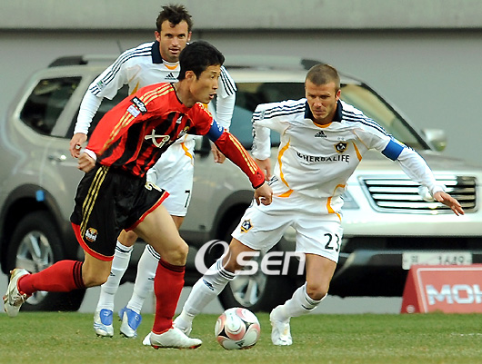 FC 서울이 골키퍼 김호준의 선방에 힘입어 LA 갤럭시에 승부차기로 이겼다. 세뇰 귀네슈 감독이 이끄는 서울은 1일 오후 4시 30분 서울 상암월드컵경기장서 열린 '모토로라컵 LA 갤럭시 코리아투어'서 전후반 1-1로 비긴 뒤 승부차기서 골키퍼 김호준이 베컴을 제외한 4명의 킥을 막아내는 활약으로 2-1로 승리했다. LA는 전방의 앨런 고든과 카를로스 루이스 그리고 셀레스틴 바바야로를 앞세워 정교한 베컴의 킥으로 서울을 공략해 갔다. 반면 서울은 부상으로 빠진 박주영과 김병지를 제외하고는 정예 멤버로 LA를 상대했다. 초반 공세를 주도한 쪽은 LA였다. 전반 13분 역습 상황에서 베컴의 롱 패스를 받아 골키퍼의 빈 틈을 노린 슈팅은 서울을 긴장하게 했다. 그리고 이 때부터 베컴의 화려한 공격이 시작됐다. 두 번의 코너킥으로 감을 조율한 베컴은 전반 20분 모두가 기대하던 상황을 연출하는 데 성공했다. 단순한 아크 정면의 프리킥 찬스가 베컴에게는 기회였다. 가볍게 감아 찬 프리킥이 긴 호를 그리며 골키퍼김호준과 페널티 에어리어 경계에 떨어진 순간 고든이 가슴으로 트래핑한 뒤 논스톱 발리슛으로 서울 골망을 흔들었다. LA의 오프사이드 트랩에도 불구하고 집요한 공격을 퍼부은 서울은 전반 30분 기대하던 성과를 얻는 데 성공했다. 후방에서 연결된 패스를 받아 페널티 에어리어를 파고들던 정조국을 알바로 피레스가 넘어뜨리자 이상용 주심이 페널티킥을 선언했고, 정조국은 침착하게 오른발 슈팅으로 동점골을 기록했다. 이후 서울의 기세는 무서웠다. 오른쪽 측면 날개로 활약한 이청용의 크로스를 받아 비록 골포트스 옆으로 흘러 아쉬움을 남겼지만 데얀이 결정적인 슈팅을 날렸다. 경기 내내 완벽한 수비를 보여준 아벨 샤비에르를 흔들었다는 것만으로도 충분한 위협이었다. 후반 들어서도 서울은 역전골을 노리며 LA를 강하게 압박했다. 이상우, 이승렬 등 젊은 피를 대거 수혈한 귀네슈 감독은 빠른 스피드로 경기를 풀어나갔다. 반면 LA는 후반 들어 전반과 달리 역동적인 모습을 보이지 못하며 어려운 경기를 자초했다. 역시 전반 전방과 미드필드를 오가며 공격을 이끌었던 브라이언 조던의 부진이 컸다. 서울로서는 교체되기 전까지 전방에서 맹활약을 펼친 이청용이 만든 찬스를 골로 연결하지 못한 것이 아쉬웠다. 빠른 움직임과 원터치에 가까운 패스 연결로 전반에 비해 더 많은 찬스를 만들어냈지만, 파상 공세에 불구하고 골문을 여는 것은 어려웠다. 양 팀은 후반 20여 분 들어 각각 김은중과 피터 바게나스를 투입하며 승부수를 던졌지만, 빈공에 시달리며 결국 승부차기로 넘어갔다. stylelomo@osen.co.kr