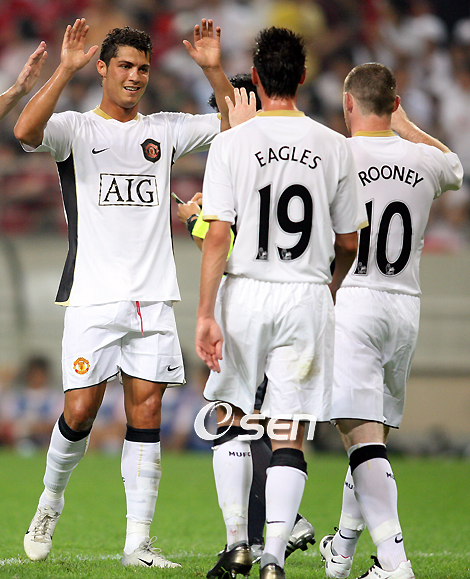 [OSEN=올드트래포드(맨체스터), 이건 특파원] 5일(한국시간) 새벽 홈에서 올림피크 리옹과 UEFA 챔피언스리그 16강 2차전을 가진 맨체스터 유나이티드(이하 맨유). 이들은 홈경기의 이점을 안고 경기를 펼쳤음에도 불구하고 전반 41분 호나우두가 단 한 골을 넣는 데 그치고 말았다. 물론 결과적으로는 1승 1무를 기록해 챔피언스리그 8강 진출에 성공했지만 득점력은 아쉬운 대목이었다. 퍼거슨 감독은 이날 4-2-3-1시스템으로 나섰다. 웨인 루니(23)를 원톱에 세운 후 좌우 날개 공격수로 나니(22)와 크리스티아누 호나우두(23)를 내세웠다. 공격형 미드필더에는 안데르손(20)을 배치했다. 공격을 맡길 4인방이 모두 20대 초반의 젊은 선수였던 것. 이는 베테랑 라이언 긱스(35)가 부상으로 경기에 출전하지 못했고 루니의 투톱 파트너로도 마땅한 선수가 없었기 때문이다. 반면 리옹의 포백을 구성한 스킬라치(28), 크리스(31), 그로소(31), 클레르(25)는 모두 20대 중반 이상이었다. 경기 초반 맨유의 젊은 창들은 상대를 거세게 몰아쳤다. 그러나 리옹이 원톱 벤제마만을 상대 진영에 두고 나머지 선수들이 모두 수비에 치중하자 맨유 공격의 날카로움이 떨어졌다. 맨유는 좌우 양날개가 개인기를 선보이고 2선에서 중거리슈팅을 날렸지만 난사하는 수준에 그치고 말았다. 경기 내내 13개의 슈팅 중 단 2개만이 골문을 향했다는 것이 맨유 공격의 효율성이 얼마나 떨어진 것인가를 단적으로 보여주는 것이었다. 선수들의 화려한 개인기는 수비에 치중하던 상대 선수들이 전열을 정비하도록 도와주었고 공간을 만드는 데는 큰 도움이 되지 못했다. 특히 후반 들어 맨유는 상대 수비수들의 실수로 많은 찬스를 잡았지만 추가골로 연결하지 못했다. 그만큼 리옹 골키퍼 쿠페의 선방이 빛나기도 했지만 결정력이 부족한 측면이 더 컸던 것이다. 이에 경기장을 꽉채운 관중들도 골이 막힐 때마다 탄식하며 아쉬워했다. 알렉스 퍼거슨 맨유 감독도 경기가 끝난 후 가진 인터뷰에서 많은 찬스를 살리지 못했던 것을 아쉬워했다. 그는 "우리 자신이 경기를 어렵게 만들었다" 고 말했다. 최대한 많은 대회에서 트로피를 들어올리기 원하는 맨유. 그들이 그 뜻을 이루기 위해서는 결정력과 경험 등 아직 많은 보완이 필요할 것으로 보인다. bbadagun@osen.co.kr