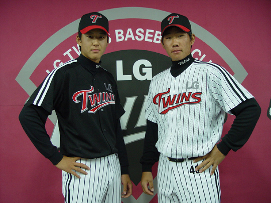 LG 트윈스가 7일 디자인이 변경된 새 유니폼을 공개했다. LG 트윈스는 작년 9월부터 선수단과 프런트 그리고 일반 팬을 대상으로 유니폼 만족도 조사를 실시 한 후, 디자인 전문가들의 자문을 거쳐 유니폼 디자인을 선정했다. 새 유니폼은 유니폼과 모자에 사용된 붉은 색을 LG그룹 고유의 색으로 통일했고, 줄무늬의 간격을 일정하게 하는 등 전체적으로 디자인의 완성도를 높이는데 초점을 뒀다. 아울러 구단 수익 증대의 일환으로 오른쪽 소매에 있던 LG그룹 로고를 가슴으로 옮겨 광고를 유치할 수 있는 공간을 확보했다. LG 트윈스의 새 유니폼을 입은 새내기 투수들인 이범준(좌)과 정찬헌(우). /LG 트윈스 제공