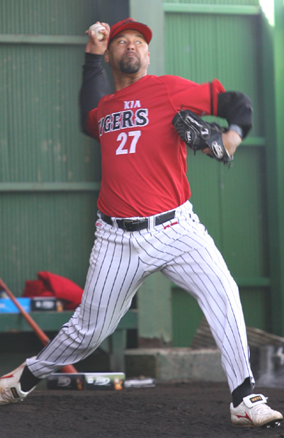 메이저리그 89승 투수 KIA 호세 리마(36)가 첫 시범경기에서 승리를 따냈다. 한화 선발 유원상(21)도 비교적 안정된 피칭을 선보였다. 한화 4번타자로 출전한 김태완은 4안타의 맹타를 휘둘렀다. 리마는 8일 대전구장에서 열린 한화와 시범경기 개막전에 선발등판, 5이닝 동안 4피안타 무실점으로 막고 팀의 4-1 승리를 이끌었다. 볼넷은 없었고 탈삼진은 1개를 기록했다. 직구 스피드는 141km를 기록했고 직구와 체인지업, 커브, 포크, 투심 등 다양한 변화구를 던졌다. 파워보다는 관록과 기교를 앞세운 피칭이었다. 초반은 불안했다. 1회말 1사 후 2안타를 맞고 위기에 몰렸으나 이도형을 우익수 플라이로 처리하고 위기를 벗어났다. 2회는 1사 후 안타를 맞았으나 유격수 병살타로 가볍게 요리했고 5회까지 별다른 위기없이 무실점으로 막았다. 리마는 "(첫 경기이어서)흥분됐지만 실제 경기처럼 최대한 타자를 알려고 노력했다. 현재 몸상태는 아주 좋고 시즌을 위한 준비가 되어 있다. 오늘은 전반적으로 피칭이 좋았고 오늘 같은 느낌으로 던지겠다"고 흡족한 평가를 내렸다. 팀의 3선발 투수로 기대를 모으고 있는 유원상은 4이닝 동안 4피안타 2볼넷 1실점했다. 3회까지 볼넷 1개만 내주며 무실점으로 막았으나 4회초 강동우에게 던진 초구 직구가 몸쪽 높은 쪽으로 흘러들어 홈런을 얻어 맞았다. 계속된 위기에서 1사 후 신인 나지완에게 2루타를 맞고 볼넷을 허용, 위기를 맞았으나 심재학을 삼진으로 잡고 한숨을 돌렸다. 최고 스피드는 146km까지 기록했고 커브 슬라이더 체인지업을 다양하게 던지며 구위 점검을 했다. KIA는 5회 2사 만루찬스에서 상대 2루수의 실책으로 한 점을 추가한 뒤 7회에도 2사 후 강동우의 평범한 타구를 놓친 상대 좌익수의 실책과 이현곤의 우중간 2루타로 추가점을 뽑았다. 8회는 중전안타로 출루한 발데스의 연속 도루와 김종국의 희생플라이로 쐐기점을 얻었다. 이날 KIA는 3개의 도루를 성공시켰다. 한화 이범호는 0-2로 뒤진 6회말 2사후 KIA 두 번째 선발 양현종을 상대로 좌중월 솔로홈런을 터트려 추격에 나섰다. 그러나 이어진 2사1,2루 찬스에서 KIA 언더핸드 유동훈에 막혀 추격의 불씨를 살리지 못했고 두 개의 실책이 실점으로 이어져 무릎을 꿇었다. 한화 김태완은 1회 우전안타, 4회 1루 강습안타, 6회 좌전안타, 8회 좌전안타를 차례로 터트려 4안타 맹타를 기록했다. 경기후 조범현 감독은 "호세 리마는 스프링캠프와 비슷한 컨디션이었다. 앞으로 볼을 좀 더 봐야 할 것 같다"며 "팀은 전체적으로 긍정적이었다. 진루타와 공격적인 주루를 하려고 노력했다. 중간투수들은 상황에 따라서 잘 던졌다"며 합격점을 매겼다. sunny@osen.co.kr KIA 타이거즈 제공. . . . . .