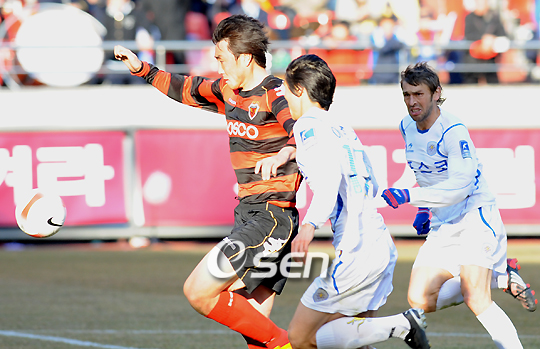 소문난 잔치에 먹을 게 많았다. 15년 만에 정상에 등극한 디펜딩 챔피언 포항 스틸러스가 FA컵 2연패의 빛나는 전남 드래곤즈를 꺾고, 깔끔한 개막전 출발을 알렸다. ‘영일만 친구’를 부르는 1만5000여 관중들이 운집한 가운데 8일 오후 포항 스틸야드에서 열린 2008 삼성 하우젠 K리그 개막전에서 홈 팀 포항은 전반 26분 김광석이 선제 헤딩골을 성공시켰으나 전남도 전반 40분 시몬이 동점골로 응수했다. 그러나 포항은 후반 종료 직전 남궁도가 결승골을 뽑아냈다. FA컵 결승전 패배 이후 절치부심, 필승을 다짐했던 포항은 이로써 역대 전적 18승 16무 18패로 균형을 이뤄냈고, FA컵을 제외한 K리그서 전남에 홈 5경기 무패 기록(4승 1무)을 이어가게 됐다. 파리아스 포항 감독과 경남 FC를 이끌다 올 시즌을 앞두고 전남 사령탑에 부임한 박항서 감독의 악연, FA컵 결승전서 2연승을 거둬 한국 축구 사상 첫 2관왕을 노렸던 포항의 꿈을 앗아간 ‘제철가 형제’ 전남의 사연까지 경기 전부터 큰 관심을 모았던 경기였다. 초반부터 팽팽한 접전이 이어졌다. 포항은 브라질 용병 듀오 데닐손과 알도를 최전방 투톱으로 배치하고, 김기동과 황지수에게 중원을 맡긴 채 좌우 측면에 박원재와 최효진을 투입해 강공으로 나섰다. 이에 맞서는 전남은 역시 용병 공격수 시몬과 산드로를 전방에 세우고, 송정현과 이상일을 미드필드 진영에 배치시켰다. 대표팀에서 맹활약을 떨쳤던 곽태휘와 이싸빅이 중심을 잡은 수비진도 여전히 튼실했다. 한 차례씩 공격권을 주고받던 양 팀의 균형이 깨진 것은 전반 26분경. 알도와 데닐손의 활발한 움직임으로 찬스를 계속 노리던 포항의 김광석이 박원재의 왼발 크로스를 짜릿한 다이빙 헤딩골로 연결하며 분위기를 뜨겁게 달궜다. 뒷 공간을 향해 파고드는 김광석의 위치를 미처 확인하지 못해 선제골을 내준 전남의 반격도 매섭게 전개됐다. 이상일의 활발한 돌파로 조금씩 포항 진영을 죄어가던 전남은 하프타임을 5분 남기고, 정인환의 프리킥을 받은 시몬이 왼발 슈팅으로 동점을 이뤄냈다. 1-1 상황에서 맞이한 후반전에서도 포항과 전남의 접전은 계속 이어졌다. 양 팀은 치열한 일진일퇴 공방을 벌이며 승리를 향한 강한 집념을 보여줬다. 곽태휘가 전반 36분 부상으로 빠졌지만 전남의 막강 수비력은 조금도 흔들리지 않았고, 포항의 강공은 날카로웠다. 포항은 후반 23분 결정적 찬스를 맞이했다. 알도를 대신해 후반 11분 교체투입된 남궁도가 강력한 슈팅을 날렸고, 전남 수비맞고 흐른 것을 데닐손이 재차 슈팅으로 연결했지만 이번에는 골대를 맞아 아쉬움을 삼켜야 했다. 그러나 포항의 집념이 더 강했다. 인저리 타임이 적용되던 종료 직전 남궁도가 상대 골키퍼 염동균과 단독으로 맞선 상황에서 득점포를 성공시켜 2-1로 승리할 수 있었다. yoshike3@osen.co.kr 남궁도가 종료 직전 결승골을 넣기에 앞서 문전으로 대시하고 있다. /포항=황세준 기자 storkjoon@osen.co.kr