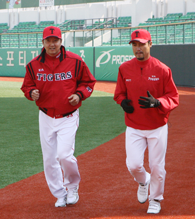 "팬들이 입단을 반겨줘 마음이 놓인다". KIA맨으로 변신한 '124승 투수' 정민태(38)가 10일 선수단에 합류했다. 정민태는 지난 9일 입단 계약서에 사인하고 자신의 자동차를 이용, 광주로 내려갔다. 광주 시내의 호텔에서 하룻밤을 묵은 뒤 10일 오전 광주구장에 나가 감독 및 선수단과 상견례를 갖고 가벼운 훈련을 했다. 오후 1시께 KIA 라커룸에서 만난 정민태는 번호 33번이 박힌 바지와 검정색 언더셔츠를 입고 있었다. 건장한 체격의 고졸 5년차 김주형의 바지였다. 그래서인지 유난히 헐거워 보였다. 그는 "최근 열흘 동안 마음 고생을 해서인지 살이 좀 빠졌다"고 이유를 설명했다. 정민태는 조범현 감독에게 인사했느냐는 질문에 "내가 코치로 온 것 같아요"라며 웃음을 지어보였다. 조범현 감독에게서 "다른 것은 없다. 풍부한 경험을 살려 젊은 투수들이 많은 KIA 마운드를 이끌어달라"는 당부의 말을 들었다는 것이다. 조 감독의 바람대로 정민태는 KIA 선수 가운데 가장 나이가 많은 선수가 됐다. 종전 최고참 이종범과 70년 개띠로 나이는 같지만 학교는 1년 선배다. 이른바 왕고참이 된 것이다. 정민태의 라커룸 자리도 이종범 심재학 등이 있는 최상석에 마련됐다. 새 물품을 지급받고 KIA 라커룸에서 짐을 정리하던 정민태는 KIA 로고가 박힌 검은색 언더셔츠(사이즈 18)에 대해 "현대 시절에는 칼라가 있는 셔츠를 입어보지 않아서인지 목이 좀 답답답하다. 나는 목이 짧다"고 말했다. 그만큼 새로운 팀에 대한 생경함을 드러낸 것이다. 마침 정민태의 옆에서 막 훈련을 끝낸 이종범이 옷을 갈아입고 있었다. 정민태는 이종범의 새카맣게 그을린 얼굴을 보고 "얼굴이 아저씨가 다 됐다"고 웃자 이종범은 "형도 우리 훈련 한 번 받아보세요, 이렇게 될 것 입니다"고 강도높은 훈련량을 은근히 설명했다. 이종범은 배려를 잊지 않았다. 정민태에게 신경을 써줘야 될 것 같다는 기자의 질문에 "아무래도 투수니까 우리들(야수)보다는 투수들과 생활을 많이 할 것이다. (투수 최고참이었던)이대진이 잘 해줄 것이다"고 따뜻하게 말을 건넸다. 정민태는 이에 앞서 광주구장 불펜 쪽에서 가벼운 운동으로 몸을 풀었다. 약 30개의 롱토스와 30m 캐치볼을 던졌다. 정민태의 볼을 받은 1군 트레이너 곽현희는 "생각보다 볼이 힘이 있다. 달라진 것 같다"고 말했다. 정민태는 "새로운 팀을 찾느라 열흘동 안 훈련을 못했다. 그 전에는 불펜에서 100개씩 볼을 던졌다. 일단 오늘 해보니 생각보다 힘이 있다. 목요일부터는 대구 원정경기를 마치고 돌아오는 1군에 합류해서 훈련할 것 같다"고 말했다. 그는 팬들에 대한 말도 잊지 않았다. "솔직히 좀 걱정이 돼서 구단 홈페이지에 들어가봤다. 대체로 입단을 반기는 분위기여서 마음이 놓였다. 앞으로 열심히 한다면 KIA 맨으로 박수를 받는 선수가 될 것이다"고 다짐했다. 조범현 감독은 "아무래도 많은 볼을 던지지 않았을 것이다. 따라서 실전피칭 일정은 정민태의 구위를 지켜보면서 결정할 것이다"고 말하고 잔류군에서 별도의 개인 스케줄에 따라 훈련을 하도록 조치했다. sunny@osen.co.kr 정민태(왼쪽)가 곽현희 트레이너와 함께 러닝하고 있다./KIA 타이거즈 제공.