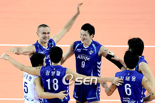 삼성화재 블루팡스가 구미에서 LIG손해보험 그레이터스를 누르고 챔피언결정전 직행을 눈 앞에 두게 됐다. 천안에서는 현대캐피탈이 한국전력을 가볍게 물리쳤다. 삼성화재는 16일 구미 박정희체육관에서 열린 NH농협 2007-2008 V리그 남자부 LIG손해보험과의 경기에서 33득점을 올린 안젤코에 활약에 힘입어 세트스코어 3-1(25-16 23-25 25-21 31-29)로 1승을 추가했다. 이로써 3연승을 올린 삼성화재는 27승 4패가 됐다. 이날 경기가 없었던 2위 대한항공은 24승 7패를 기록 중이며 두 팀은 모두 4경기를 남겨 놓고 있는 상황. 한편 두 팀은 오는 19일 대전에서 맞붙게 된다. 만약 이날 삼성화재가 승리를 거둘 경우 정규리그 우승을 확정짓는다. 하지만 두 팀은 올 시즌 상대전적에서 6전 3승 3패로 팽팽해 승부를 예측기는 힘들다. 지난 5일 경기서는 삼성화재가 세트스코어 3-1로 이긴 바 있다. 같은 시각 천안에서는 현대캐피탈이 한국전력을 세트스코어 3-0(25-17 25-16 25-20)으로 물리치고 4연승을 달렸다. 반면 한국전력은 10연패. 이미 플레이오프 진출을 확정지은 현대캐피탈은 송인석이 11득점, 로드리고가 11득점 등 선수들이 고르게 활약했다. 7rhdwn@osen.co.kr