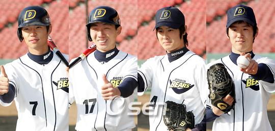 두산 베어스는 2001년 이후 7년 만의 한국시리즈 우승에 도전하고 있다. 특히 지난 시즌 SK 와이번스와 한국 시리즈에서는 첫 2경기를 승리하고도 내리 4경기를 내주며 프로야구 사상 첫 '2연승 후 4연패 준우승'이라는 달갑지 않은 기록을 세웠다. 기선 제압에 성공하고도 눈 앞에서 미끄러졌던 지난 시즌을 생각하면 2008 시즌 한국 시리즈 우승을 향한 두산의 심정은 더욱 절박하다. 더욱이 올 시즌이 끝나면 김경문(50) 감독 및 주포 김동주(32)와 계약도 끝나기 때문에 그만큼 우승에 대한 집념도 뜨겁다. 올 시즌 두산에는 더 나은 미래를 꿈꾸는 신예 '7번 라인'이 있다. 이들은 현재 팀 내 위치에 있어 조금씩 차이가 있지만 올 시즌 쏠쏠한 활약을 기대하기에 충분한 유망주들이다. NO 7. 오재원-NO 17. 김용의, 우리도 '육상부' 등번호 7번 오재원(23)과 등번호 17번 김용의(23. 사진). 둘은 여러 모로 공통점이 많다. 대학 시절 팀의 중심 타자(오재원-경희대, 김용의-고려대)로 활약하며 국가대표에 뽑히기도 했고 내야와 외야를 모두 맡을 수 있다. 공을 맞추는 능력도 갖춘 야수고 발도 빨라 단독 도루도 가능하다. 호리호리한 체구(오재원 185cm 75kg, 김용의 186cm 75kg)도 비슷하다. 다른 점이 있다면 둘의 포지션이다. 오재원은 3루와 유격수 백업으로 출장할 것으로 보이며 김용의는 1루와 외야 수업을 받고 있는 중이다. 김용의는 고려대 시절 3루수를 맡았으나 다소 동작이 딱딱하고 수비 시 몸의 중심도 위쪽에 있어 완벽한 3루 수비를 펼치기에는 조금 무리가 있었다. 김동주가 3루에 있다는 이유도 컸다. 둘은 시즌이 개막되면 교체 멤버로 출장을 기다릴 예정이다. 김용의가 출장 중인 우익수 자리에는 민병헌(21), 1루에는 정원석(30)이 있고 오재원이 들어갈 수 있는 3루, 유격수 자리에는 각각 김동주, 이대수(27)가 있다. 그러나 이들은 두산의 '발야구'에 분명 필요한 선수들이라 출장 기회는 언제든지 잡을 수 있을 전망이다. 두산은 LG 트윈스와 함께 넓은 잠실 구장을 홈으로 쓰는 팀이다. 지난 시즌 팀 홈런 78개로 LG와 함께 공동 5위에 그쳐 '거포 효과'보다는 발로 한 베이스를 더 가는 야구가 필요한 팀이기도 하다. 지난 시즌 도루 113개를 합작, 극심한 견제를 받을 것으로 예상되는 '발야구 3총사' 이종욱(28), 고영민(24), 민병헌 외에도 경기 막판 상대를 흔드는 빠른 주자가 더 필요한 팀이 바로 두산이다. 김 감독은 오재원과 김용의에게 이 역할을 기대하고 있다. 홍성흔(32)과 안경현(39)의 출장 여부가 불투명하고 중심타선 또한 이전에 비해 빈약해져 2008' 시즌에는 더 세밀하고 넓은 '작전 야구'가 필요한 시점이다. 오재원과 김용의가 경기 막판 빠른 발로 상대 배터리를 '압박'한다면 두산은 '작전 야구'를 더욱 넓게 구사할 수 있을 것이다. NO 27. 김명제-NO 57. 진야곱 '내일은 에이스' 등번호 27번 김명제(22)와 등번호 57번 진야곱(19)은 두산 투수진이 기대하고 있는 유망주들이다. 특히, 김명제는 김 감독이 27번을 지정해 달아 줄 정도로 애정을 쏟고 있다. 27번은 2006년까지 박명환(31. LG)이 달고 있었고, 지난 시즌 다니엘 리오스(36. 야쿠르트 스월로스)가 사용했던 '두산의 에이스' 번호다. 진야곱 또한 동경하는 우상인 요한 산타나(29. 뉴욕 메츠)의 57번을 '찜'했다. 지난 시즌 57번을 달고 있던 이승학(29)이 55번을 선택, 진야곱은 '번호표 경쟁' 없이 57번을 달 수 있었다. 윤석환(47) 두산 투수코치는 미야자키 전지훈련 당시 "(진)야곱이는 어깨 근력이 좋아 볼 끝이 상당히 좋다. 훈련 자세도 성실하고 배우려는 자세가 마음에 든다."라며 진야곱에 대한 기대를 숨기지 않았다. 그러나 둘에 대한 2008시즌 기대치는 약간 다르다. 두산은 올 시즌 김명제가 자신의 잠재력을 폭발시켜 맷 랜들(31), 게리 레스(35), 김선우(31), 이승학(29)과 함께 선발진에서 큰 힘이 되어주길 바라고 있다. 지난 시즌 초반 부진으로 인한 2군행과 트레이드 설에 휘말리는 등 우여곡절을 겪었던 김명제는 2007년 10월 17일 한화 이글스와의 플레이오프 3차전에서 6⅔이닝 3피안타 무실점의 호투를 펼치며 다시 기대를 모았다. 김명제의 지난 시즌 성적은 4승 7패 평균자책점 5.05다. 김명제는 150km/h가 넘는 빠른 직구를 가지고 있다. 그러나 직구에 비해 슬라이더, 체인지업의 구사력이 떨어졌고 공을 잡아 채서 던지기보다는 힘으로 밀어던지는 인상이 짙어 대성하지 못한 유망주이기도 했다. 다시 김 감독의 믿음을 산 김명제에게 2008 시즌은 그 어느 때보다 중요하다. 진야곱은 성남고 시절이던 지난해 8월, 대만에서 열린 아시아청소년선수권에서 154km/h의 직구를 던지며 관계자들을 놀라게 했다. 그러나 시범경기를 치르고 있는 현재, 그의 직구 구속은 140km/h정도로 느려져 있다. 아직 페이스가 완전히 올라오지 않은 상태이기도 하지만 조금씩 투구폼을 고쳐가고 있는 중이기 때문. 진야곱은 지난해 초 팔 각도를 올리고 투구폼을 조금 더 크게 하면서 여름 들어 직구 구속이 150km/h이상으로 부쩍 올라갔다. 그러나 그의 투구폼은 주자가 나가면 달라진다. 고교 시절에는 빠른 공으로 타자들의 출루를 원천봉쇄할 수 있었지만 고교 야구와 프로 야구는 분명 다르다. 다리