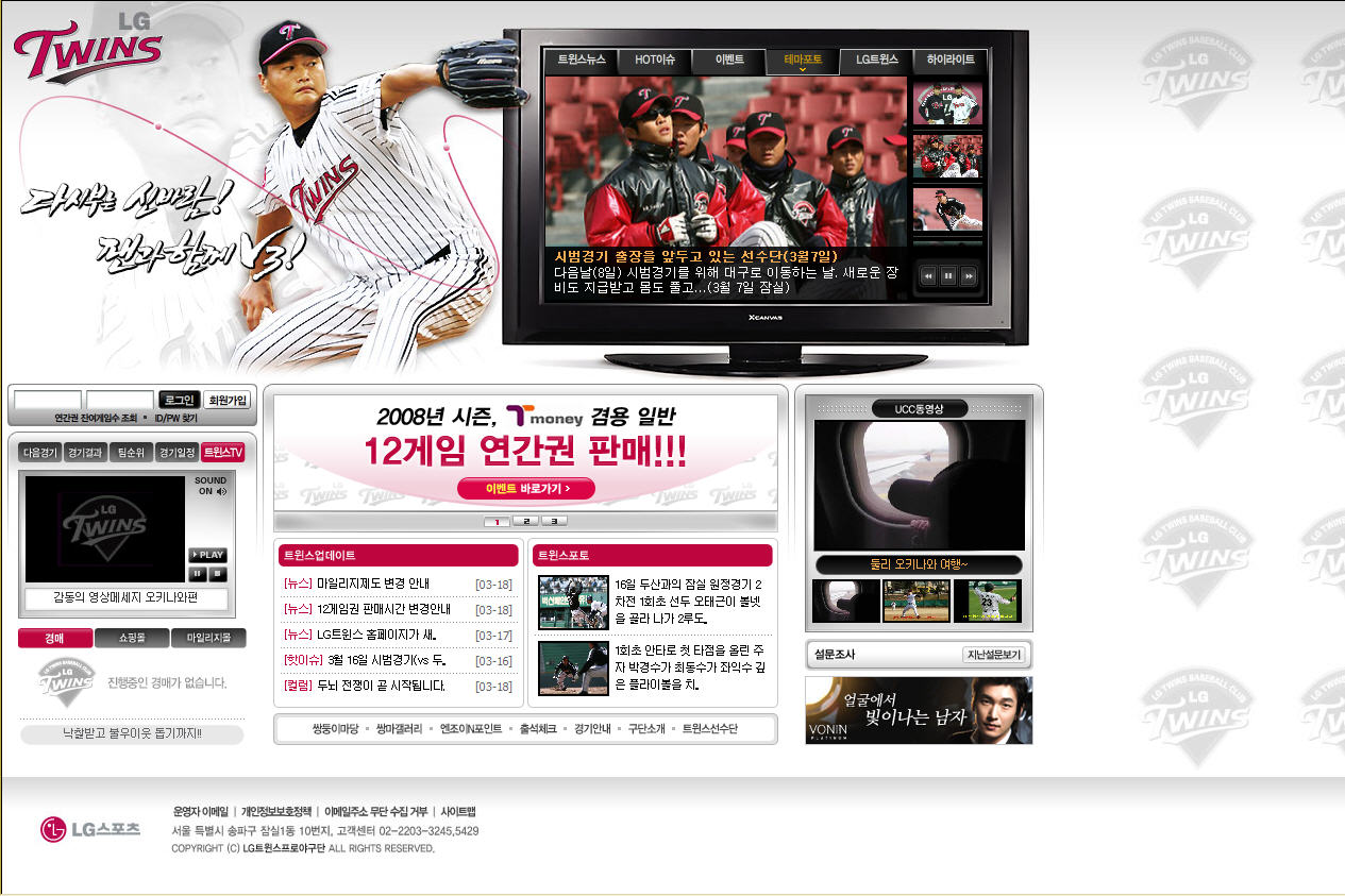 LG 트윈스가 2008시즌을 맞이하여 19일 홈페이지를 새롭게 단장 개편했다. 새롭게 개편된 홈페이지는 ‘다시부는 신바람! 팬과 함께 V3!’라는 2008시즌 캐치프레이즈에 맞춰 팬들과 구단간의 다양한 채널을 통해 교감의 장을 넓히면서, 정보 전달과 팬들의 사용 편의성을 더욱 강화하고, LG로고의 빨강과 회색을 이용하여 밝고 깔끔한 이미지를 보여주는 데 중점을 뒀다. 주요 개편 내용으로는 팝업창을 지양하고 메인화면에 모니터와 전광판 형상을 구성하여 쉽고 편리하게 정보확인이 가능하며 한 화면에서 경기 결과와 관련된 내용을 모두 확인할 수 있도록 사용편의성을 추구했다. 또 홈페이지 메뉴를 회원 개개인이 직접 설정할 수 있는 개인 퀵링크 기능을 추가하였고, 회원들간의 원활한 커뮤니케이션을 위한 쪽지기능 서비스를 도입하여 4월부터 실시하는 등 팬들의 요구를 적극적으로 수렴했다. 한편 콘텐츠 부문에서도 지난해 팬들로부터 좋은 호응을 얻었던 ‘궁금해’코너를 별도의 메뉴로 분리하였으며 회원 본인의 LG 트윈스 홈페이지에 대한 애정을 확인할 수 있는 출석체크 기능, 그리고 선수들에게 직접 팬레터를 보낼 수 있는 ‘팬레터 보내기’코너를 신설 메뉴로 구성했다. sun@osen.co.kr