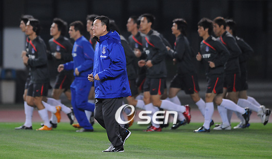 오는 26일 중국 상해 홍커우 스타디움에서 열리는 북한과 2010 남아공 월드컵 아시아 3차예선 2차전에 나설 국가대표팀이 23일 격전지 상하이에 도착, 이날 합류한 프리미어리거 이영표 설기현 김두현과 함께 위안센 스포츠센터에서 야간훈련을 가졌다. 허정무 감독이 선수들이 러닝하는 동안 그라운드 안에서 가볍게 달리고 있다./상하이=손용호 기자spjj@osen.co.kr