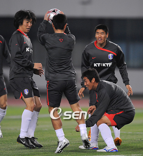 오는 26일 중국 상해 홍커우 스타디움에서 열리는 북한과 2010 남아공 월드컵 아시아 3차예선 2차전에 나설 국가대표팀이 23일 격전지 상하이에 도착, 이날 현지로 합류한 이영표 설기현 김두현과 함께 위안센 스포츠센터에서 야간훈련을 가졌다. 볼을 갖고 하는 술래잡기 비슷한 훈련에서 설기현과 이영표가 팀을 이뤄 조병국을 쫓고 있다./상하이=손용호 기자spjj@osen.co.kr