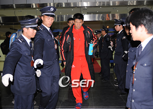 오는 26일 중국 상해 홍커우 스타디움에서 열리는 북한과 2010 남아공 월드컵 아시아 3차예선 2차전에 나설 국가대표팀이 23일 격전지 상하이에 도착, 이날 현지로 합류한 이영표 설기현 김두현과 함께 위안센 스포츠센터에서 야간훈련을 가졌다. 한국에 앞서 훈련을 가진 북한 선수들이 중국 공안의 삼엄한 경호 속에 경기장을 빠져 나가고 있다./상하이=손용호 기자spjj@osen.co.kr