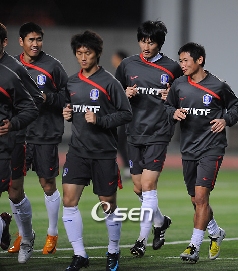 북한과 2010 남아공월드컵 아시아 지역 3차 예선 두 번째 경기를 앞둔 허정무 감독이 이끄는 한국 대표팀이 상하이 입성후 첫 번째 훈련을 실시했다. 23일 낮 중국 상하이 현지에 도착, 크라운 호텔에 여장을 푼 대표팀은 저녁에 위안선 스포츠 센터에서 약 한 시간 반 가량 비교적 강도 높은 담금질을 가졌다. 설기현(풀햄 FC), 이영표(토튼햄 핫스퍼), 김두현(웨스트 브롬위치) 등 해외파 3명이 가세한 21명의 선수단은 허정무 감독과 정해성 수석코치의 집중적인 조련 속에 패싱 게임에 주력했다. 북한 대표팀에 이어 곧바로 그라운드에 들어선 대표팀 선수단은 반데를레이 피지컬 트레이너와 함께 손뼉을 치며 가볍게 조깅을 실시하며 약 15분간 몸을 풀었다. 이어 일부 선수들이 노란색 조끼를 입고, 회색 트레이닝복을 입은 다른 동료들과 함께 패스를 주고받으며 볼 터치 연습을 가졌다. '포지션 게임'이라 명명된 3차례 패싱 게임을 통해 조직력 다지기에 주력하는 동안 박주영-서상민, 설기현-염기훈, 조재진-김두현 등은 한 조를 이뤄 슈팅 연습을 펼치기도 했다. 훈련 중간중간 정 코치는 "좀 더 빨리 빨리"를 외쳐대며 패스 템포를 점차 높여갔고, 허 감독도 박수를 치며 필드 위에서 볼을 쫓아 다니는 선수들을 독려했다. 상하이 입국에 앞서 한 차례 현지 점검을 다녀온 바 있는 정 코치는 "그라운드 상태는 아주 좋은 편"이라며 "위안선 스포츠 센터의 필드와 크게 다르진 않지만 양쪽 모두 괜찮다"고 만족감을 드러냈다. 한편 훈련을 마친 뒤 숙소로 돌아가기 위해 밝은 표정으로 그라운드를 빠져나가던 허 감독은 "선수단 분위기가 아주 좋다. 느낌도 나쁘지 않다"면서 한껏 기대감을 부풀렸다. 해외파의 컨디션에 대해 허 감독은 "오늘 입국했기 때문에 휴식차 훈련에 참여하지 말라고 했는데 본인들 스스로 자청해 훈련했다"고 환한 미소를 지어보였다. yoshike3@osen.co.kr 설기현과 이영표가 조재진을 사이에 두고 밝은 표정으로 이야기를 나누며 러닝하고 있다./상하이=손용호 기자spjj@osen.co.kr
