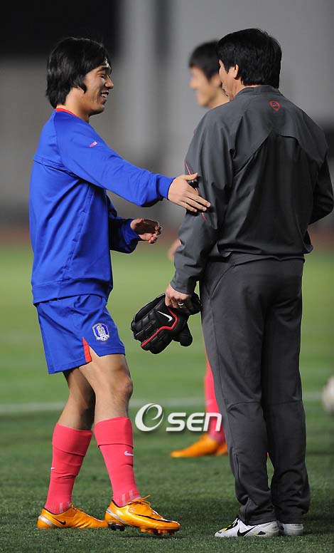 오는 26일 중국 상해 홍커우 스타디움에서 열리는 북한과 2010 남아공 월드컵 아시아 3차예선 2차전에 나설 국가대표팀이 24일 위안센 스포츠센터에서 오범석이 팀에 합류 본격적인 팀 훈련에 들어갔다. 박지성은 비행기가 연착 이날 팀 훈련에 참가하지 못했다. 미니게임중 박주영이 김현태 코치에게 벌칙을 받아야 한다며 옷깃을 잡아 끌고 있다./상하이=손용호 기자spjj@osen.co.kr