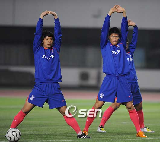 오는 26일 중국 상해 홍커우 스타디움에서 열리는 북한과 2010 남아공 월드컵 아시아 3차예선 2차전에 나설 국가대표팀이 24일 위안센 스포츠센터에서 오범석이 팀에 합류 본격적인 팀 훈련에 들어갔다. 박지성은 비행기 연착으로 이날 팀 훈련에 참가하지 못했다. 염기훈과 설기현이 함께 스트레칭을 하고 있다 /상하이=손용호 기자spjj@osen.co.kr