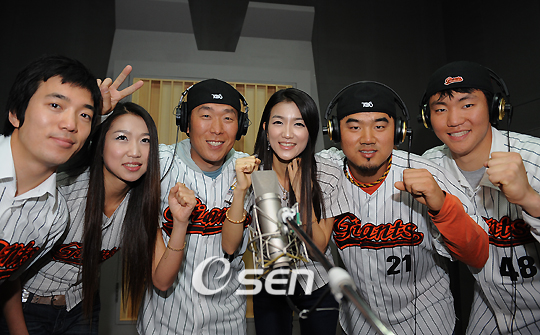 롯데 자이언츠는 25일 오전 10시 서울 마포구 망원동 TONE 스튜디오에서 앨범에 참여하는 가수와 선수가 모인 가운데 음반제작 발표회를 갖고 녹음과 뮤직비디오 일부를 촬영했다. 가수는 박상민, 노브레인, 가요톱텐, 쿨에이지, 슈가도넛, 자니로얄이고 정수근, 송승준, 장성우가 롯데 응원단과 함께 참여했다. 발표회가 끝난 뒤 녹음실에서 선수들과 응원단이 모여 포토타임을 갖고 있다. /민경훈 기자 rumi@osen.co.kr