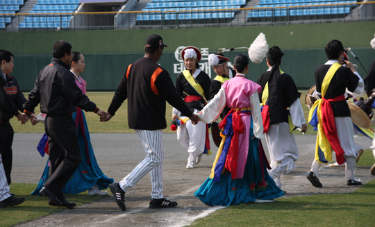 거인 군단의 용사들이 27일 오전 사직구장에서 열린 기원식을 통해 '가을에도 야구하자'는 간절한 소망을 염원했다. 박진웅 대표이사를 비롯한 전 임직원과 제리 로이스터 감독 이하 선수단이 모두 참석한 가운데 열린 이날 행사는 식전 행사인 풍물패의 '터밟기' 행사를 시작으로 한해의 소망을 기원하는 '비나리' 행사, 풍물패의 '판굿 공연'. 롯데 임직원 및 선수단의 화합을 다지는 의미를 담은 풍물패의 '대동놀이' 순서로 진행됐다. 박 대표이사, 로이스터 감독, 주장 정수근이 올 시즌 롯데 자이언츠의 선전을 기원하는 풍선 테이프를 커팅했다. 풍선이 하늘 위로 올라갈 때 많은 선수들은 저마다 자신의 소원을 빌었다. 손민한과 박현승 등 대부분의 선수들은 올해 소망을 "팀의 4강 진출"이라고 말했다. 특히 올 시즌 8년 만에 고향으로 돌아온 마해영은 '부활'이라는 단어로 표현하며 "나와 팀의 부활을 바란다"고 표현했다. 로이스터 감독의 황태자 박기혁은 "수비에서 국내 최고가 되고 3할 타율을 기록하겠다"고 다짐했고 김주찬은 "40 도루이상 하겠다"고 약속했다. 올 시즌 거인 군단의 주장을 맡은 정수근은 "매년 4강 간다는 거짓말 했다. 지난해 상조회장(주장)이 했던 말이 마지막 거짓말이었으면 좋겠다"고 4강 진출에 대한 강한 열망을 드러냈다. 한편 외국인 선수 카림 가르시아와 마티 매클레리는 처음 보는 낯선 광경에 대열에서 빠져 신기하게 입을 벌리고 지켜봤다는 후문. 가르시아는 "한국 문화에 대해 잘 몰랐지만 재미있고 신기한 모습이 많았다"며 "오늘 기원식을 통해 한해 소망을 빈다고 하던데 개인적으로 올시즌은 최고의 외국인 선수가 되겠다"고 목소리를 높였다. what@osen.co.kr 롯데 자이언츠 제공.