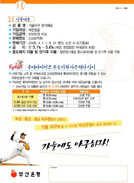 부산은행은 오는 4월 1일 SK와 갖는 롯데 홈 개막전에 맞춰 지난해에 이어 '가을야구 정기예금' 상품을 판매한다. 이 상품은 기본 금리(5.6%)에 롯데가 4위로 포스트시즌에 진출할 시 모든 가입자에게 보너스 금리률 0.1%를 추가로 지급하고 이중 20명을 추첨하여 연 10.0%의 금리를 제공한다. 또한 이대호가 홈런 20개 이상 기록하거나 손민한 선수가 15승 이상 거둘 경우 250명을 추첨하여 0.2~0.3%를 추가로 지급한다. 한편 신규가입 고객 중 선착순 2000명에게는 롯데 홈경기 자유입장권(1인 2매)를 제공한다. what@osen.co.kr 롯데 자이언츠 제공.