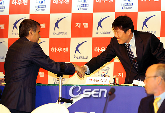 새로운 라이벌이 된 수원-서울의 올 시즌 첫 맞대결 승자는 어디?. 지난해 4월 8일 서울 상암월드컵경기장서 5만 5397명의 역대 프로 스포츠 사상 최다 관중 기록을 세웠던 FC 서울과 수원 삼성이 오는 2일 상암서 삼성 하우젠 컵대회 A조 맞대결을 펼친다. 최근 K리그서 최고 라이벌로 부각되고 있는 서울과 수원은 최고의 빅매치로 꼽히고 있다. 단순히 많은 관중을 동원하는 팀이라는 인식보다는 한국 축구를 짊어지고 갈 신형 스트라이커들의 정면 대결이기 때문에 더욱 관심을 끌고 있다. 국가대표팀 주전 공격수로 성장한 박주영은 지난달 15일 전북전에서 마수걸이 골을 터트리며 최고의 자리에 올랐다. 26일 북한과 2010 남아공월드컵 3차지역예선 2차전 대결서도 전방 공격수로 나서 활발한 움직임을 보였고 30일 대구와의 경기서도 자신의 몫을 충분히 해냈다. 또 수원은 차범근 감독이 많은 관심을 보이고 있는 신영록이 있다. 한국의 '루디 펠러'혹은 '드록바'라는 별명으로 불리우고 있는 그는 29일 경남과의 경기서 1골 1어시스트를 기록하며 올 시즌 마수걸이 골을 득점해 최고의 활약을 펼쳤다. 올 시즌 첫 번째로 맞붙게 된 서울과 수원의 대결은 용호상박의 양상이 될 전망이다. 지난 시즌 주전 선수들의 줄부상으로 선수단 구성에 어려움을 겪었던 서울은 박주영, 김은중과 인천에서 새로 영입한 데얀 등 공격수가 넘처나는 상황. 특히 신인 이승렬까지 가세하며 세뇰 귀네슈 감독이 어느 선수를 기용할까 하는 행복한 고민을 하게 만들었다. 수원도 이에 뒤지지 않는다. 신영록을 필두로 에두, 서동현, 안효연 그리고 부상에서 회복한 김대의 등 공격진이 신구조화를 이루며 올 시즌 무패행진을 이어가고 있기 때문에 치열한 접전이 예상된다. 결국 서울과 수원의 대결은 공격수들이 얼마나 득점포를 가동하는가가 승부에 큰 영향을 끼칠 전망이다. 물론 소문난 잔치에 먹을 것이 없다고는 하지만 올 시즌 K리그서 매경기 많은 득점포를 가동하고 있는 양 팀이기 때문에 큰 기대를 걸어볼 만하다. 과연 올 시즌 들어 최고의 빅매치로 꼽히는 서울과 수원의 첫 대결서 누가 이름을 드높이며 팀을 승리로 이끌게 될지 주목된다. 10bird@osen.co.kr 지난달 미디어데이 행사서 악수를 나누는 귀네슈-차범근 감독.