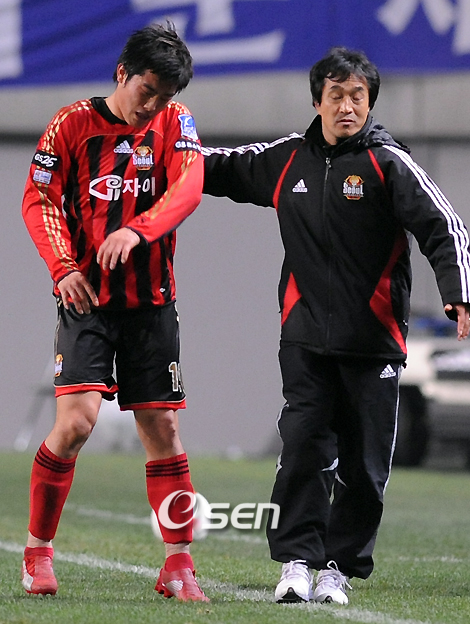 '삼성 하우젠컵 2008' 라이벌전인 수원 삼성과 FC 서울의 경기가 2일 상암 월드컵경기장에서 벌어져 서동현의 결승골과 조용태의 추가골에 힘입어 수원이 2-0로 승리를 거뒀다. 후반 종료 직전 수원 송종국과 시비가 붙어 퇴장당한 서울 이상협이 억울한 듯 이영진 코치에 이끌려 그라운드를 떠나고 있다. /상암=황세준 기자 storkjoon@osen.co.kr