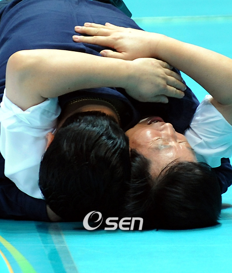 'NH농협07-08 V리그' 대한항공과 현대캐피탈의 플레이오프 마지막 3차전 경기가 6일 인천 도원체육관에서 벌어져 현대캐피탈이 세트스코어 3-1로 역전승, 2승 1패로 챔피언 결정전에 진출했다. 현대캐피탈 김호철 감독이 승부가 결정되자 스태프와 부둥켜 안고 코트에 누워 기쁨을 만끽하고 있다. /인천=황세준 기자 storkjoon@osen.co.kr