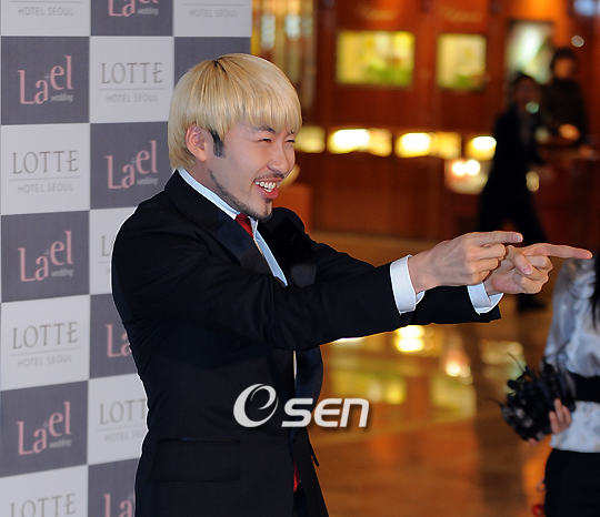 개그맨 박명수(38)가 6일 오후 5시 서울 소공동 롯데호텔 크리스탈 볼룸에서 8살 연하의 피부과 의사 한모(30)씨와 결혼식을 올린다. 박명수는 식전 호텔 1층 로비에서 기자회견을 갖고, 결혼에 이르기까지의 각종 에피소드와 비하인드 스토리를 공개했다. 결혼식 하객으로 온 노홍철이 포토존에서 포토타임을 갖고 있다. /민경훈 기자 rumi@osen.co.kr
