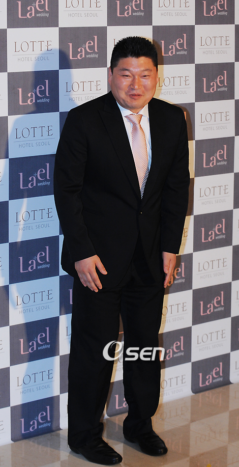 개그맨 박명수(38)가 6일 오후 5시 서울 소공동 롯데호텔 크리스탈 볼룸에서 8살 연하의 피부과 의사 한모(30)씨와 결혼식을 올린다. 박명수는 식전 호텔 1층 로비에서 기자회견을 갖고, 결혼에 이르기까지의 각종 에피소드와 비하인드 스토리를 공개했다. 결혼식 하객으로 온 강호동이 포토존에서 포토타임을 갖고 있다. /민경훈 기자 rumi@osen.co.kr