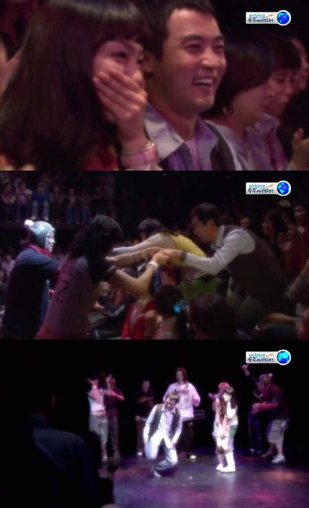 지난 7일 첫 방송된 SBS 월화드라마 ‘사랑해’에 뮤지컬 ‘비보이를 사랑한 발레리나’ 공연 장면이 삽입돼 눈길을 모았다. 서울 홍익대 근처의 한 극장에서 공연되고 있는 ‘비보이를 사랑한 발레리나’는 2년이 넘도록 매진 행렬을 달리고 있는 화제작으로 지난해 영국 에딘버러 프린지 페스티벌에서 별 5개, 최고점을 받았고 출연중인 익스트림크루는 비보이 월드컵이라 불리는 독일 ‘배틀오브더이어’ 챔피언이다. 또 국내외 유명 인사들이 소문을 듣고 공연을 보기 위해 끊임 없이 찾고 있는 것으로도 유명한데 최근에는 이명박 대통령과 미국의 인기스타 웨슬리 스나입스가 다녀간 것으로 알려졌다. 드라마 협찬 장소로 ‘비보이를 사랑한 발레리나’가 선택된 이유는 이런 유명세 외에도 이 극이 갖는 자유분방함과 흥겨움, 열정에 있다. 극중에서 주인공 석철수(안재욱 분)가 나영희(서지혜 분)에게 호감을 갖게 되면서 데이트 장소로 공연장을 찾는데 역동적이고 자유분방한 분위기 속에서 탄성과 환호를 보내며 즐겁게 공연을 관람했다. 이 때 댄서 배우들이 갑자기 둘의 손을 잡아끌어 무대로 나오게 하는데 안재욱과 서지혜는 당황스러움을 감추지 못하다가 이내 코믹한 막춤을 선보이며 관객들의 박수를 받았다. 촬영 당시 관객 안에 안재욱과 서지혜가 있다는 것은 비밀에 부쳐졌고 공연은 여느 때와 마찬가지로 신기에 가까운 춤에 매료된 관객들의 함성 속에 열기가 달아오르고 있었다. 원래 공연에 있던 신인 관객과 함께 하는 댄스타임에 안재욱과 서지혜가 끌려 나가 춤을 추자 그때서야 관객들은 드라마 촬영이 진행되고 있음을 눈치 챘고 연기인지 실제인지 분간이 되지 않는 그들의 돌발적인 즉흥 댄스에 분위기는 더욱 달아 올랐다. 공연이 끝나고 안재욱과 서지혜는 극중 배우들과 인사를 나누며 “촬영이 진행 중이긴 했지만 공연을 보는 동안 완전히 몰입이 돼 박수와 환호가 절로 나왔다”며 감탄을 했다. happy@osen.co.kr