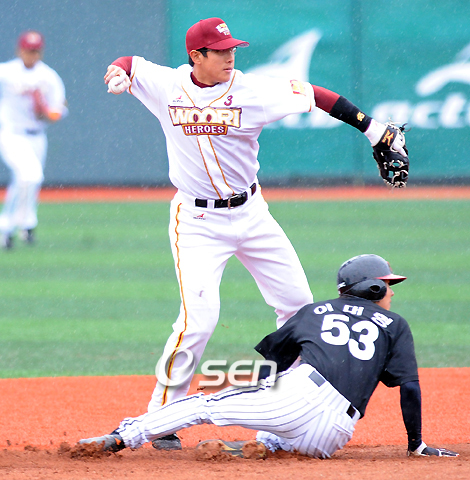 '2008 삼성 PAVV 프로야구' 우리 히어로즈와 LG 트윈스의 경기가 9일 목동야구장에서 벌어져 우리가 7-3으로 역전승했다. LG의 7회초 1사 1루서 대타 김준호의 투수 앞 땅볼 때 2루에서 포스아웃된 1루주자 이대형이 1루를 바라보고 있다. 우리 유격수 황재균의 악송구로 김준호는 살았다. /목동=황세준 기자 storkjoon@osen.co.kr