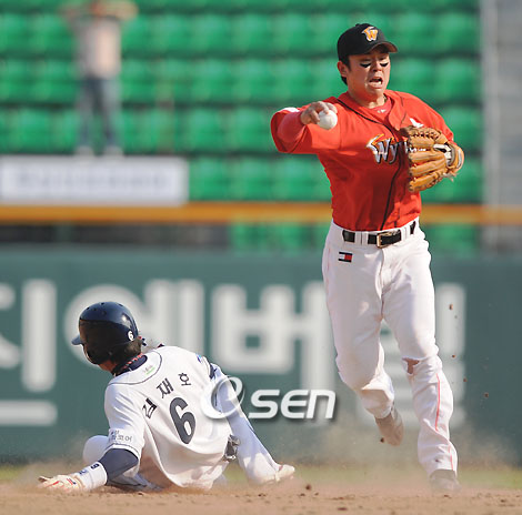 '2008 삼성 PAVV 프로야구' 두산 베어스와 SK 와이번스 경기가 19일 잠실구장에서 벌어졌다. 두산 7회말 1사 1루서 오재원의 내야땅볼 때 1루 대주자 김재호가 병살을 막기 위해 슬라이딩하다 SK 유격수 나주환의 무릎 부위 유니폼을 스파이크로 찢고 있다. 나주환은 1루로 송구하지 못했으나 SK의 항의에도 수비방해는 인정되지 않았다./잠실=김영민 기자ajyoung@osen.co.kr