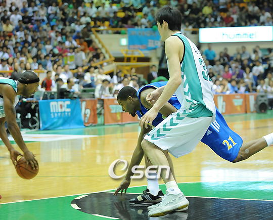 '2007-2008 SK텔레콤 T 프로농구' 원주 동부와 서울 삼성의 7전 4선승제 챔피언결정전 2차전이 19일 오후 원주 치악체육관에서 열려 정규리그 우승팀 동부가 100-96로 이겨 1차전에 이어 2연승을 거뒀다. 4쿼터 삼성 토마스가 드리블하다 발을 헛딛어 흘린 공을 동부의 딕슨이 재빠르게 잡아채고 있다. /원주=민경훈 기자 rumi@osen.co.kr