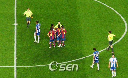 [OSEN=노우캄프(바르셀로나), 이건 특파원] FC 바르셀로나가 '바르셀로나 더비'에서 0-0 무승부를 기록했다. 바르셀로나는 20일(이하 한국시간) 새벽 노우캄프에서 열린 에스파뇰과의 홈경기에서 상대의 밀집 수비를 뚫지 못하고 득점 없이 비겼다. 경기의 전체적인 주도권은 바르셀로나에게 있었다. 프랑크 라이카르트 바르셀로나 감독은 주중에 있을 챔피언스리그를 대비해 앙리를 아끼는 모습이었다. 오랜 부상 후 복귀한 메시도 일단은 벤치에서 시작하는 모습. 바르셀로나는 에투를 축으로 좌우에 보얀과 도스 산토스를 놓고 공격형 미드필더로는 구드욘센을 배치했다. 이같은 전형으로 상대를 압박했다. 전력이 처지는 에스파뇰은 선수비 후역습으로 나서며 영리하게 경기를 풀어나갔다. 바르셀로나는 공세를 폈으나 골을 만들어내지 못했다. 이어진 공격들은 에스파뇰 수비수들과 골키퍼의 선방에 막혔고 중원에서도 이따금씩 상대의 역습을 허용했다 경기가 풀리지 않자 라이카르트 감독은 리오넬 메시와 이니에스타를 투입했다. 메시가 들어가자 경기가 살아났다. 오른쪽 사이드에서 메시는 공간을 치고 나가는 드리블과 개인기로 상대 수비수를 뚫어냈다. 특히 중앙에서 이니에스타와의 2대 1패스를 통한 돌파는 상당히 위협적이었다. 메시의 활약에도 불구하고 바르셀로나는 마무리를 짓지 못했다. 메시의 몸상태가 최선은 아니었고 마무리를 지어주어야 할 에투도 몸이 무거웠다. 결국 시간이 지날수록 에스파뇰은 끈끈한 수비력으로 바르셀로나를 압박했고 양 팀은 0-0 무승부를 거두었다. 바르셀로나는 24일 오전 홈에서 맨체스터 유나이티드와 UEFA 챔피언스리그 4강 1차전을 가질 예정이다. bbadagun@osen.co.kr 경기 후 주심에게 항의하는 바르셀로나 선수들.