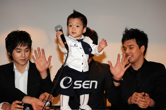 좌충우돌 다섯 남자의 따뜻한 육아일기 '다섯남자와 아기천사' 기자간담회가 28일 서울 청담동 한 레스토랑에서 열렸다. 무관심 속에서 소외되고 있는 어린 아기들에게 가족을 찾아 주기 위한 취지로, 다섯 남자가 아기(해찬)를 양육하는 모습을 그린 휴머니즘 리얼리티 형식의 프로그램이다. 아기천사' 해찬이가 마이크를 들고 취재진들을 향해 인사하고 있다. /황세준 기자 storkjoon@osen.co.kr