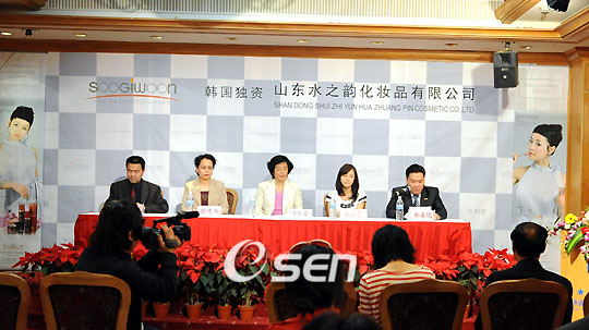 중국에서 자신의 이름을 딴 화장품 브랜드를 런칭하는 CF 퀸 김다은이 28일 중국 산동성 제남시 소재 롱두국제호텔에서 산동 수지운 화장품유한공사가 주관한 기자회견에 참석하고 있다. 김다은은 수지운 화장품으로부터 받을 모델료 전액을 중국 제남시의 불우 어린이 돕기에 기부하기로 해 현지 언론의 특별한 관심을 받았다. 오른쪽 두 번째가 김다은. /제남(중국 산동성)=강희수 기자 100c@osen.co.kr