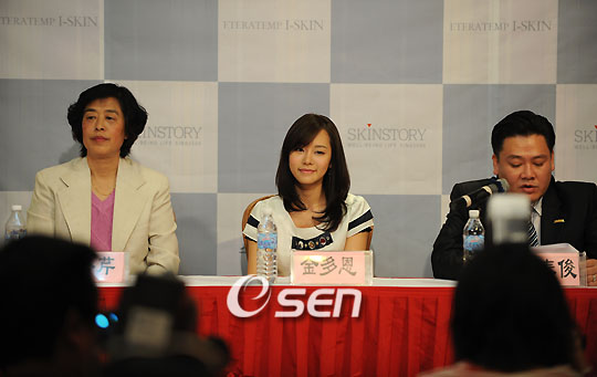 중국에서 자신의 이름을 딴 화장품 브랜드를 런칭하는 CF 퀸 김다은이 28일 중국 산동성 제남시 소재 롱두국제호텔에서 산동 수지운 화장품유한공사가 주관한 기자회견에 참석하고 있다. 김다은은 모델료 전액을 중국 제남시의 불우 어린이 돕기에 기부하기로 해 현지 언론의 특별한 관심을 받았다. 수지운 화장품 박태준 대표이사(맨 오른쪽)의 경과 보고를 김다은이 유심히 듣고 있다. 맨 왼쪽은 쉬쓰이퀸 제남시 정부 대외우호협회 부회장. /제남(중국 산동성)=강희수 기자 100c@osen.co.kr