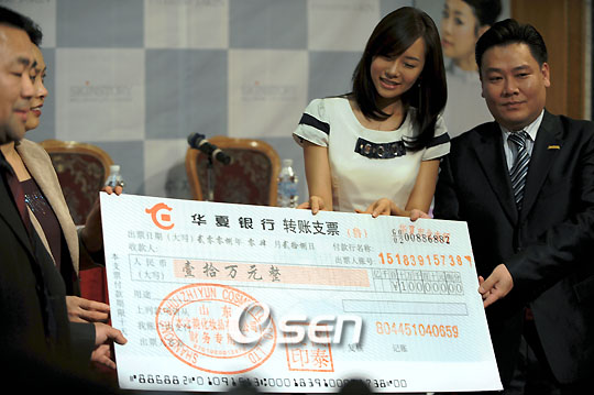 중국에서 자신의 이름을 딴 화장품 브랜드를 런칭하는 CF 퀸 김다은이 28일 중국 산동성 제남시 소재 롱두국제호텔에서 산동 수지운 화장품유한공사가 주관한 기자회견에 참석하고 있다. 김다은은 모델료 전액을 중국 제남시의 불우 어린이 돕기에 기부하기로 해 현지 언론의 특별한 관심을 받았다. 김다은과 박태준 수지운 화장품 대표이사(오른쪽)가 제남시 교육부 관계자들에게 1차분 10만 위안(약 1400만 원)의 기부증서를 전달하고 있다. 박태준 대표이사도 이날 연간 수익의 1%를 제남시에 기부하기로 약속했다. /제남(중국 산동성)=강희수 기자 100c@osen.co.kr