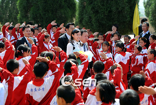 전문 CF 모델 김다은이 민간사절단 구실을 톡톡히 했다. 김다은은 29일 오전 중국 산동성 제남시 태산 자락에 있는 서장초등학교를 방문해 학교 발전 성금 1차분 10만 위안(약 1400만 원)을 전달했다. 이 행사에는 유의상 대한민국 주청도총영사관 부총영사, 쉬쓰이퀸 제남시정부 대외우호협회 부회장, 박태준 수지운 화장품 대표이사 등이 참석해 양국의 우의를 다지는 뜻 깊은 자리가 됐다. 수지운 화장품은 중국에서 김다은의 이름을 딴 화장품을 런칭할 계획이고 김다은은 이 회사로부터 받은 모델료를 중국의 불우한 학생들을 돕는데 쓰겠다며 선뜻 성금으로 내 놓았다. 서장초등학교는 제남시에서도 벽지에 해당돼 비가오면 교실로 빗물이 샐 정도로 교육 환경이 열악하다. 김다은이 서장초등학교 학생들의 환영을 받으며 행사장으로 이동하고 있다. /제남(중국 산동성)=강희수 기자 100c@osen.co.kr