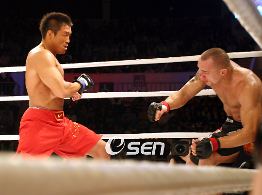 '드림2'에 출전한 '슈퍼 코리안' 데니스 강이 복병에 무릎을 꿇고 말았다. 29일 일본 사이타마 슈퍼아레나에서 열린 '드림2 미들급 그랑프리 개막전'에 출전한 데니스 강은 게가드 무사시(네덜란드)에게 KO패를 당했다. 데니스 강은 경기 초반 기습적인 펀치로 게가드를 압박한 뒤 양다리를 잡고 태클한 뒤 테이크 다운에 성공했다. 상위 포지션을 점유한 데니스 강은 오른팔에 기무라를 시도했으나 실패했다. 경기를 잘 풀어나가던 데니스 강은 캔버스에 누워있는 게가드에게 접근하다 늪에 빠져들었다. 게가드는 데니스 강을 양다리를 붙든 뒤 오른팔을 잡아 트라이앵글 초크를 시도했다. 게가드에게 완전히 잡힌 데니스 강은 탭아웃으로 경기를 포기했다. 하지만 승부는 순식간에 뒤집혔다. 파운딩을 시도하던 데니스의 팔을 게가드가 잡고 트라이앵글 초크를 시도한 것. 얼굴이 빨갛게 달아오른 데니스 강은 순식간에 탭을 했고 경기는 게가드의 승리로 1라운드 초반 끝이 났다. 지난해 서울서 열린 올림피아 히어로스 2007 대회서 추성훈에게 KO패를 당하며 체면을 구긴 데니스 강은 이번 대회서도 패배를 당하며 슬럼프에 빠지고 말았다. 10bird@osen.co.kr 지난해 올림피아 히어로스 2007 대회서 추성훈에게 KO 당하는 데니스 강.