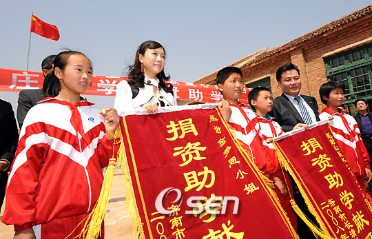 전문 CF 모델 김다은이 민간사절단 구실을 톡톡히 했다. 김다은은 29일 오전 중국 산동성 제남시 태산 자락에 있는 서장초등학교를 방문해 학교 발전 성금 1차분 10만 위안(약 1400만 원)을 전달했다. 이날 행사에는 유의상 대한민국 주청도총영사관 부총영사, 쉬쓰이퀸 제남시정부 대외우호협회 부회장, 박태준 수지운 화장품 대표이사 등이 참석해 양국의 우의를 다지는 뜻 깊은 자리가 됐다. 수지운 화장품은 중국에서 김다은의 이름을 딴 화장품을 런칭할 계획이고 김다은은 이 회사로부터 받은 모델료를 중국의 불우한 학생들을 돕는데 쓰겠다며 선뜻 성금으로 내 놓았다. 서장초등학교는 제남시에서도 벽지에 해당돼 비가 오면 교실에 빗물이 샐 정도로 교육 환경이 열악하다. 김다은이 학교 휘장을 든 서장초등학교 대표들과 함께 기념사진을 찍고 있다. /제남(중국 산동성)=강희수 기자 100c@osen.co.kr