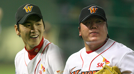 그야말로 최고의 궁합이다. SK 김광현(20)과 채병룡(29)이 9승을 합작, 올 시즌 8개 구단 최고의 극강 룸메이트로 떠올랐다. 올 시즌부터 원정 경기에서 한 방을 쓰고 있는 김광현과 채병룡은 각각 5승(1패)과 4승을 기록하며 다승 부문 1, 2위를 달리고 있다. 이 둘은 평균자책점도 각각 1.75와 1.98을 기록, 이 부문에서 나란히 1, 2위에 올라있어 선의의 팀내 경쟁으로 SK 코칭스태프를 흡족하게 만들고 있다. 채병룡은 29일 대전 한화전에서 8이닝 5피안타 4탈삼진 무사사구 1실점으로 시즌 4승째를 거뒀다. 올 시즌 가장 많은 이닝을 소화했고 투구수는 99개에 그쳤다. 시즌 4승과 함께 평균자책점은 더 내렸다. 팀은 최소경기(25경기) 20승이라는 역대 최고 기록과 어깨를 나란히 했다. 채병룡은 경기 후 "룸메이트 김광현에게 감기라도 옮겨야 될 것 같다"며 "광현이와 다승왕을 다투고 싶다"고 농담을 던지며 대한 선의의 경쟁자의 이름을 거론, 선의의 경쟁을 다짐했다. 같은 방을 쓰고 있는 김광현의 호투가 좋은 자극제로 작용했다는 뜻이었다. 시즌 시작은 둘 다 좋지 못했다. '2년차' 좌완 선발 김광현은 팀내 2선발로 낙점받아 지난달 30일 문학 LG전에 선발로 나섰다. 그러나 2⅔이닝 동안 6개의 안타를 맞고 3실점하며 강판되는 수모를 겪었다. 김광현은 베이징올림픽 대표팀으로 최종예선을 뛰고 돌아온 후 왼 어깨 뒤쪽 근육통을 호소, 시범경기에서 1경기도 뛰지 못한 채 시즌을 맞았다. "투구폼이 약간 변했다"는 김성근 감독의 말처럼 지난 시즌 막판 보여준 상승세를 이어가지 못했다. 하지만 조금씩 제 페이스를 끌어올린 김광현은 이후 등판한 5경기에서 모두 퀄리티스타트로 승수를 챙겼다. 첫 경기 부진으로 10.12를 기록했던 평균자책점은 어느새 1점대로 내렸다. 지금의 추세라면 0점대까지 노려볼 만한 분위기다. 채병룡 역시 시즌 전만해도 스프링캠프 막판에 얻은 왼 허벅지 근육통으로 볼끝이 무뎌졌다는 평을 들었다. 급기야 시즌 선발 로테이션에서 탈락하기도 했다. 그러나 지난달 30일 선발 김광현에 이어 등판, 4⅓이닝을 무실점으로 책임져 살아났다. 앞서 던진 김광현의 부진을 말끔하게 대신 해소한 쾌투였다. 첫 승은 채병룡이 먼저 신고했다. 채병룡은 지난 4일 문학 두산전에서 7이닝 1실점했다. 김광현은 다음날 등판에서 승리투수가 되며 첫 등판의 악몽을 말끔히 씻어냈다. 그리고 지난 10일 광주 KIA전에서 2승을 먼저 신고해 채병룡을 제치고 앞서 나가기 시작했다. 김성근 감독은 29일 경기에서 역대 최소경기 20승에 도달한 후 "선발진이 잘 버텨준 것이 빨리 20승 고지를 밟게 된 요인"이라고 칭찬을 아끼지 않았다. 김광현과 채병룡의 선의의 경쟁 속에 한국시리즈 2연패라는 목표를 향해 달리는 SK의 행보도 더욱 가속도가 붙고 있다. letmeout@osen.co.kr 김광현-채병룡. . . . . .